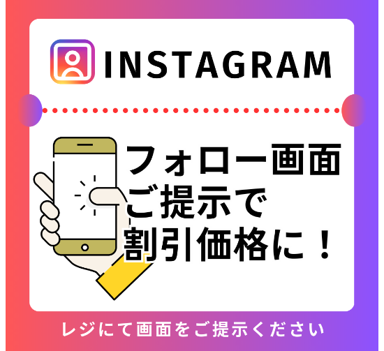 下記のWEB割引券画面または、インスタフォロー画面をスマホで店頭でご提示いただくと
