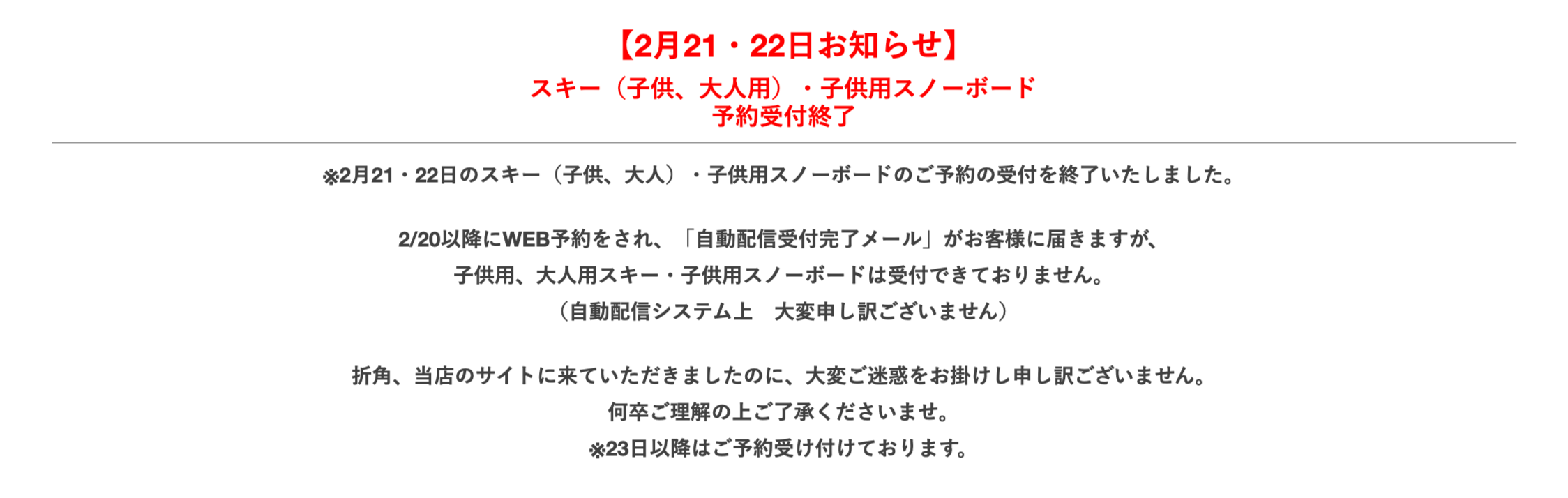 2/20以降にWEB予約をされ、「自動配信受付完了メール」がお客様に届きますが、子供用、大人用スキー・子供用スノーボードは受付できておりません。